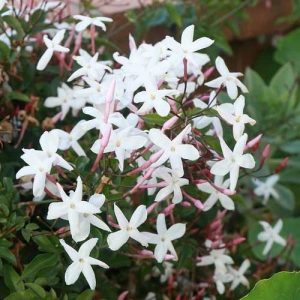 Cunoscută sub denumirea populară de ”Iasomia de China”, Jasminum polyanthum este un arbust cățărător cu ramuri roșii și cu frunze mici